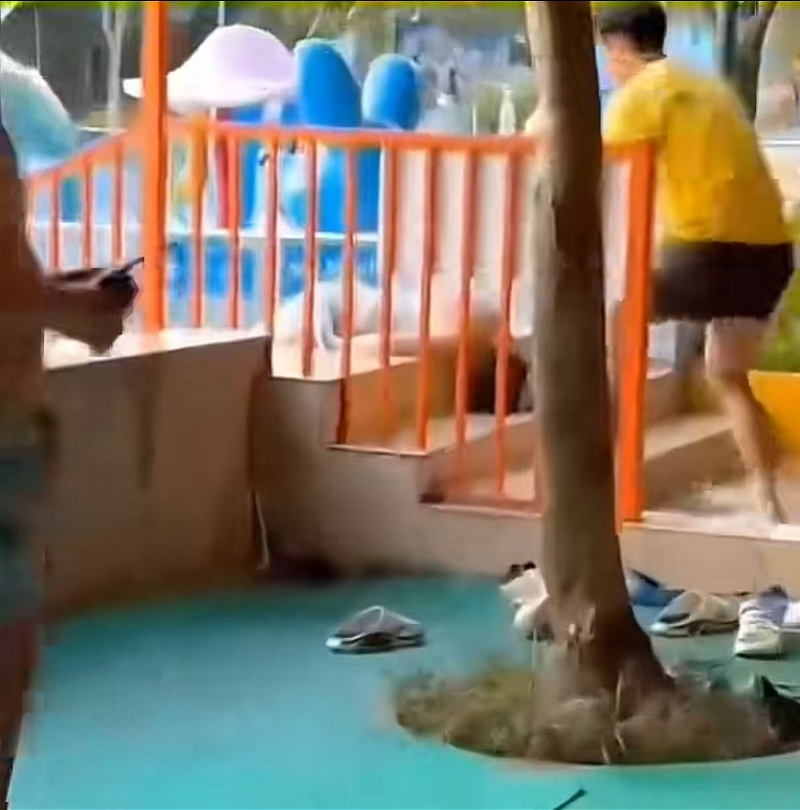 据网友发布的视频,7月19日,重庆万州威尼斯水上乐园泳池边有人倒伏在地。一名身穿黄色衣服的救生员上前试图把倒地者拉出来,另一名手持木扫帚的救生员也试图救人,结果却滑倒在地。旁边的游客大呼“那里面(泳池)有电”。